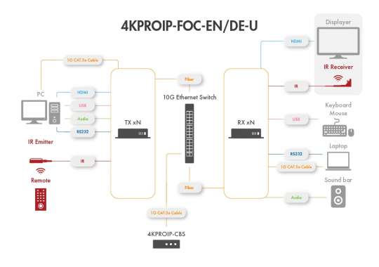 The aegis 4KPROIP-KVM fiber series includes the 4KPROIP-FOC-EN-U encoder and 4KPROIP-FOC-DE-U decoder. The aegis 4KPROIP-FOC-EN-U fiber KVM encoder is the core component of a professional-grade long-distance IP video transmission system, supporting UHD 4K60Hz (4:4:4) video processing. It connects to video sources via an HDMI® interface, converts the signal, and transmits it through fiber optic cables to a 10Gb Ethernet switch, achieving uncompressed, zero-latency high-quality audio and video transmission. A single fiber optic cable supports ultra-long-distance transmission of up to 20 kilometers. The system is specially integrated with USB 2.0 KVM functionality, enabling remote operation of keyboards and mice, and is equipped with a 3.5mm audio interface, bidirectional infrared, and RS232 control functions. Through a web interface, users can flexibly configure matrix switching, video walls, and multi-view displays. Combined with video scaling functionality, it is particularly suitable for professional application scenarios requiring long-distance KVM control, such as large venues, inter-building connections, educational campuses, and corporate headquarters.