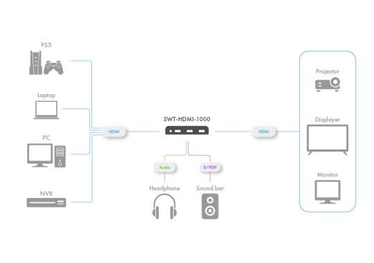 The aegis SWT-HDMI-1000 signal switcher supports lossless switching of four HDMI® input signals to a single display device. Thanks to its smart switching mechanism, all your HDMI® devices—whether it’s a DVD player, gaming console, set-top box, camcorder, or A/V receiver—can be integrated onto this single unit. Equipped with a dual control mode, featuring remote operation and front panel buttons, it allows you to easily switch between multiple video sources. This makes the SWT-HDMI-1000 an ideal solution for both home theaters and professional audio-visual spaces.