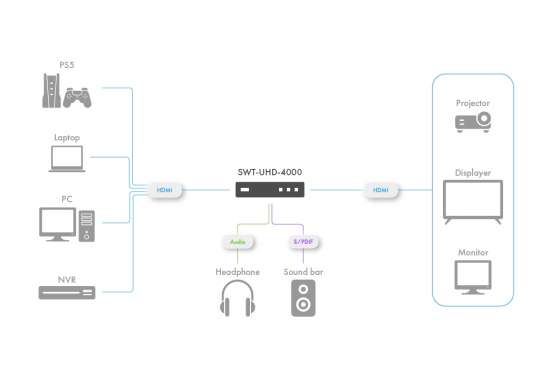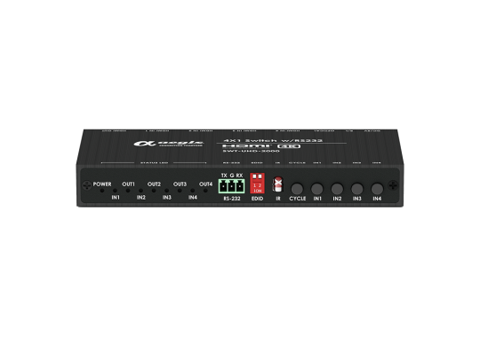 Aegis SWT-UHD-4000 is a HDMI® switcher that supports four HDMI® source inputs and outputs to a single display device. This product supports up to 4K 60Hz resolution and HDR technology, featuring smart automatic signal switching and time polling functions, with customizable 10/15/20 second auto-cycling options. It supports various audio output formats, including optical and analog stereo, providing a complete solution for professional audio-visual applications. Equipped with audio output ports for convenient connection to headphones, speakers, or amplifiers.
