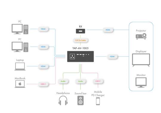 The aegis TAP-AV-1005 4K Table Converter is a professional-grade multi-functional AV switcher, featuring three HDMI® inputs and one USB 3.0 Type-C input, supporting both single-screen and multi-screen split display.Utilizing HDBaseT technology, it extends 4K@30Hz signals up to 100 meters and 1080P signals up to 150 meters. The device includes an intuitive touch panel, dual audio output ports, PD fast charging, and a universal power outlet.With front and rear audio output ports, it allows seamless connection to headphones, speakers, or amplifiers. Its sleek brushed-metal finish and versatile installation options make it an ideal AV integration solution for professional environments.
