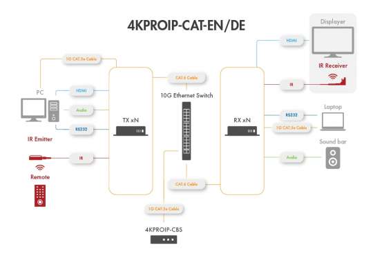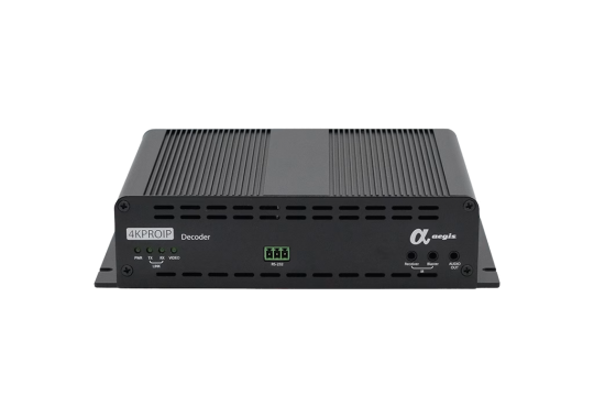 The aegis 4KPROIP network series includes the 4KPROIP-CAT-EN encoder and 4KPROIP-CAT-DE decoder. The aegis 4KPROIP-CAT-DE decoder is a key component of a professional-grade IP video solution. It receives and decodes video signals via a 10Gb Ethernet switch and outputs them to display devices through an HDMI® interface. Utilizing SDVoE technology, it supports UHD 4K60Hz (4:4:4) resolution, delivering uncompressed, zero-latency premium audio and video quality, with a single Cat.6 network cable supporting transmission distances of up to 100 meters. The system offers a variety of display configuration options, including matrix switching, video walls, and multi-view displays. Built-in video scaling functionality enhances system scalability, while the web interface, infrared, and RS232 interface provide a convenient operational experience. This solution is particularly suitable for professional application scenarios such as commercial exhibitions, educational venues, large-scale events, surveillance systems, and medical environments.