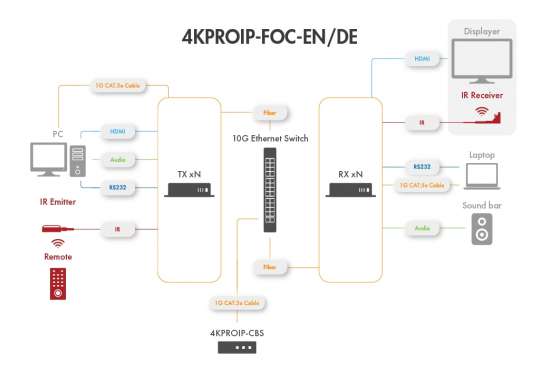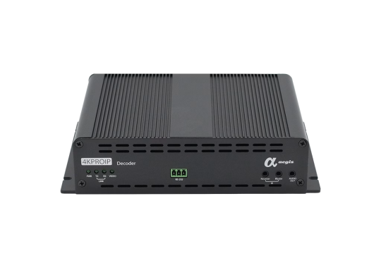 The aegis 4KPROIP fiber series includes the 4KPROIP-FOC-EN encoder and 4KPROIP-FOC-DE decoder. The aegis 4KPROIP-FOC-DE fiber decoder is the receiving component of a professional-grade long-distance IP video transmission system, supporting UHD 4K60Hz (4:4:4) video processing. It receives signals from a 10Gb Ethernet switch via a fiber optic interface, decodes them, and outputs them through HDMI® to display devices, achieving uncompressed, zero-latency high-quality audio and video playback. A single fiber optic cable supports ultra-long-distance transmission of up to 20 kilometers. The system provides bidirectional infrared and RS232 control functions, enabling remote control of the video source equipment at the encoder end. Through a web interface, users can flexibly configure matrix switching, video walls, and multi-view displays. Combined with video scaling functionality, it is particularly suitable for professional application scenarios requiring long-distance transmission, such as large venues, inter-building connections, educational campuses, and corporate headquarters.
