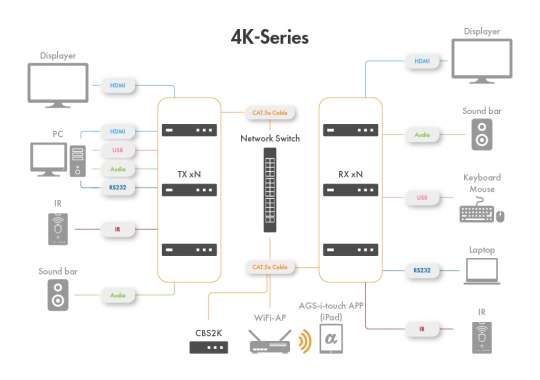 ◎ Integrates transmission of video signals/audio signals/USB data/RS232 control/HDMI signals/IR control over IP networks.