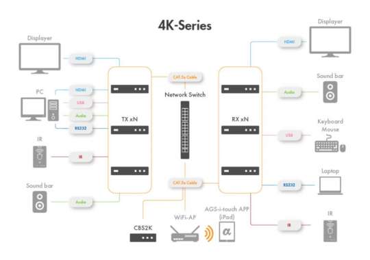 ◎ Integrates transmission of video signals/audio signals/USB data/RS232 control/HDMI signals/IR control over IP networks.