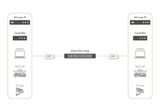 ESW-POE-1024 is a high-performance and stable 24-port + 4 1G Combo (RJ45/Fiber) PoE managed switch. Its RJ45 ports support 10/100/1000 Mbps, providing efficient network connectivity and power delivery. The device supports fast forwarding on all ports and features MDI/MDIX automatic crossover detection, ensuring an optimal network experience. Using store-and-forward technology and dynamic memory allocation, the switch optimizes bandwidth allocation to meet high-traffic transmission demands. It is equipped with a highly reliable wide voltage input design, ensuring stable operation even under fluctuating voltage conditions. The switch supports multi-mode operation to adapt to various environments and features plug-and-play functionality, enabling users to quickly deploy network infrastructure with ease and efficiency. This makes the ESW-POE-1024 an ideal choice for enterprise-grade network construction.