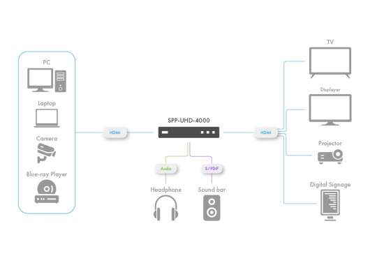 | Output Ports | 4×HDMI® Type A [19-pin female] 1×L/R Audio out [3.5mm Stereo Mini-jack] 1×Optical out [S/PDIF] |